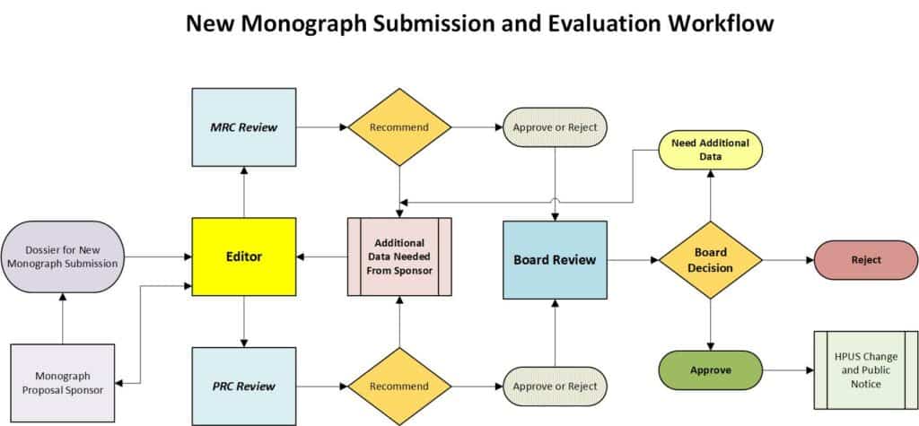Monographs may be submitted to HPCUS by external Sponsors or by HPCUS itself. The monograph should be prepared in a format and with supporting documentation and safety data according to the guideline documents in the HPUS. New Monographs will be evaluated according to current HPCUS Guidelines on Monograph Review and HPCUS Criteria for Eligibility for Inclusion in the HPUS at the time of submission. All New Monographs must receive HPCUS Board Approval prior to entry into the HPUS.